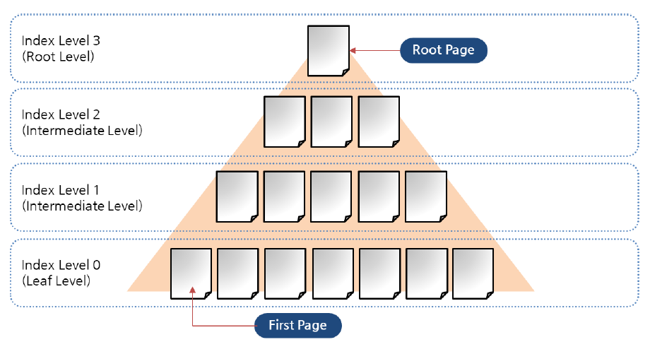 mssql의 index 구조는 Root - Leaf 구조로 이루어져 있으며, 중간 트리에 intermediate page 로 구성되어 있다.