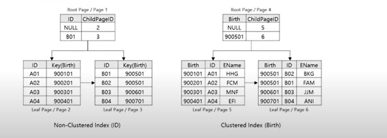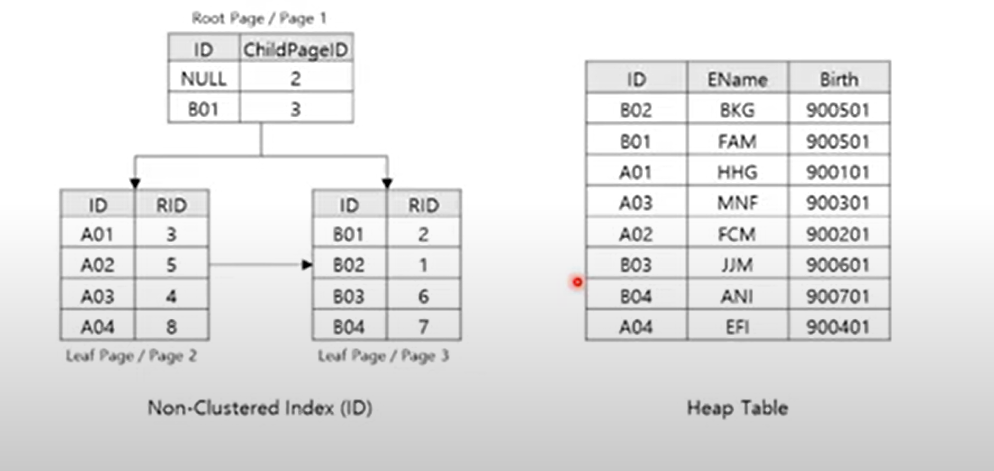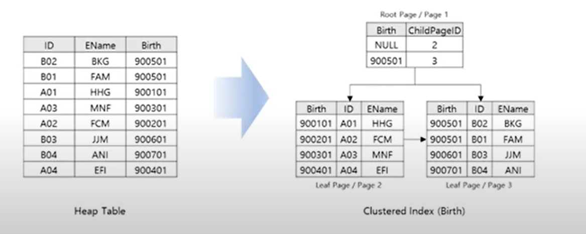 - 클러스터형 인덱스를 생성하는 순간 해당 테이블의 데이터는 Heap 방식이 아닌 B-Tree 구조로 저장된다.