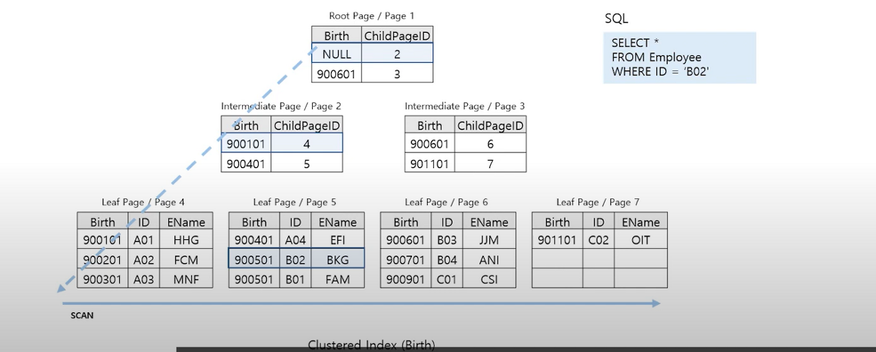 - 클러스터드 인덱스의 Leaf 페이지를 모두 탐색
