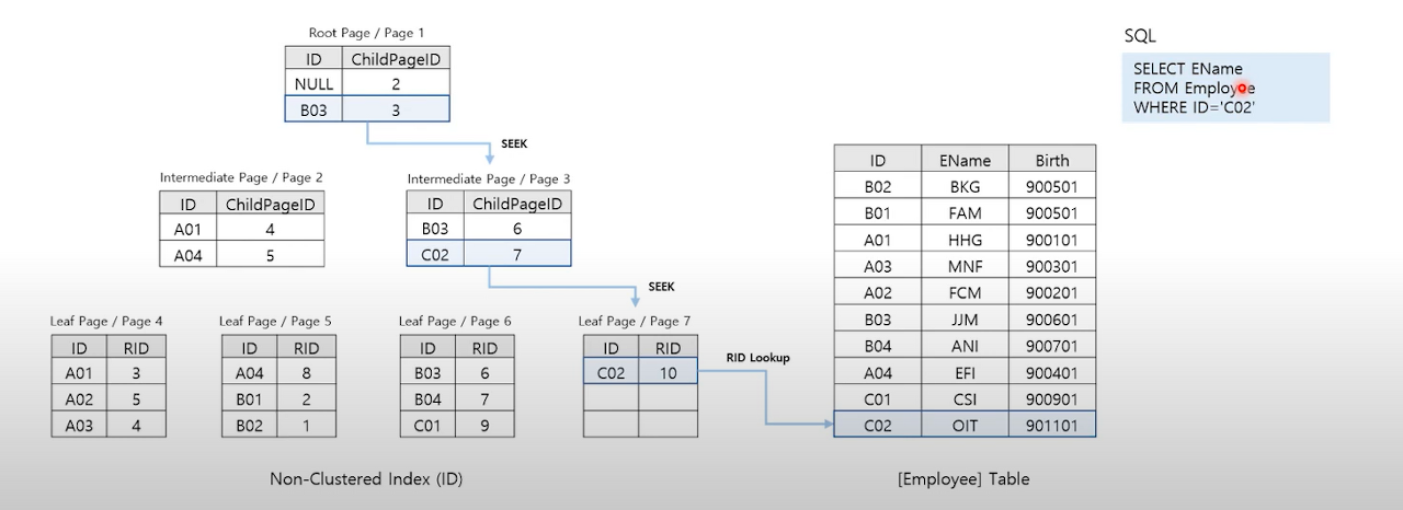 - Non-Clustered Index Seek을 통해 해당 데이터의 주소값(RID)을 조회한 후 해당 주소를 Heap 테이블에서 조회