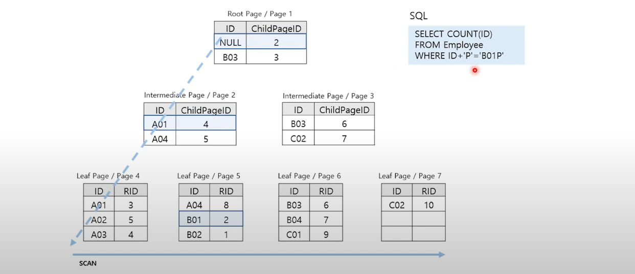 → 비 클러스터드 인덱스 키를 사용하였으나, 가공되어 모든 leaf page를 탐색