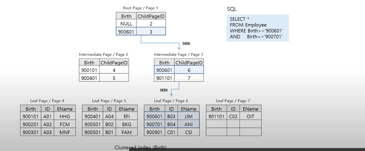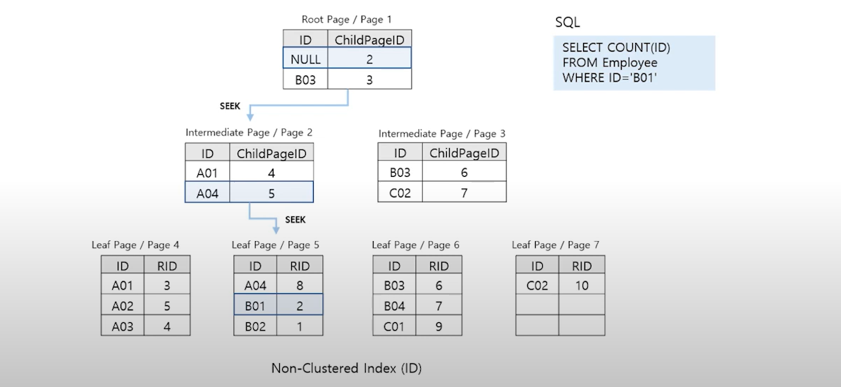 - Non-clustered Index의 Leaf 모든 페이지 탐색