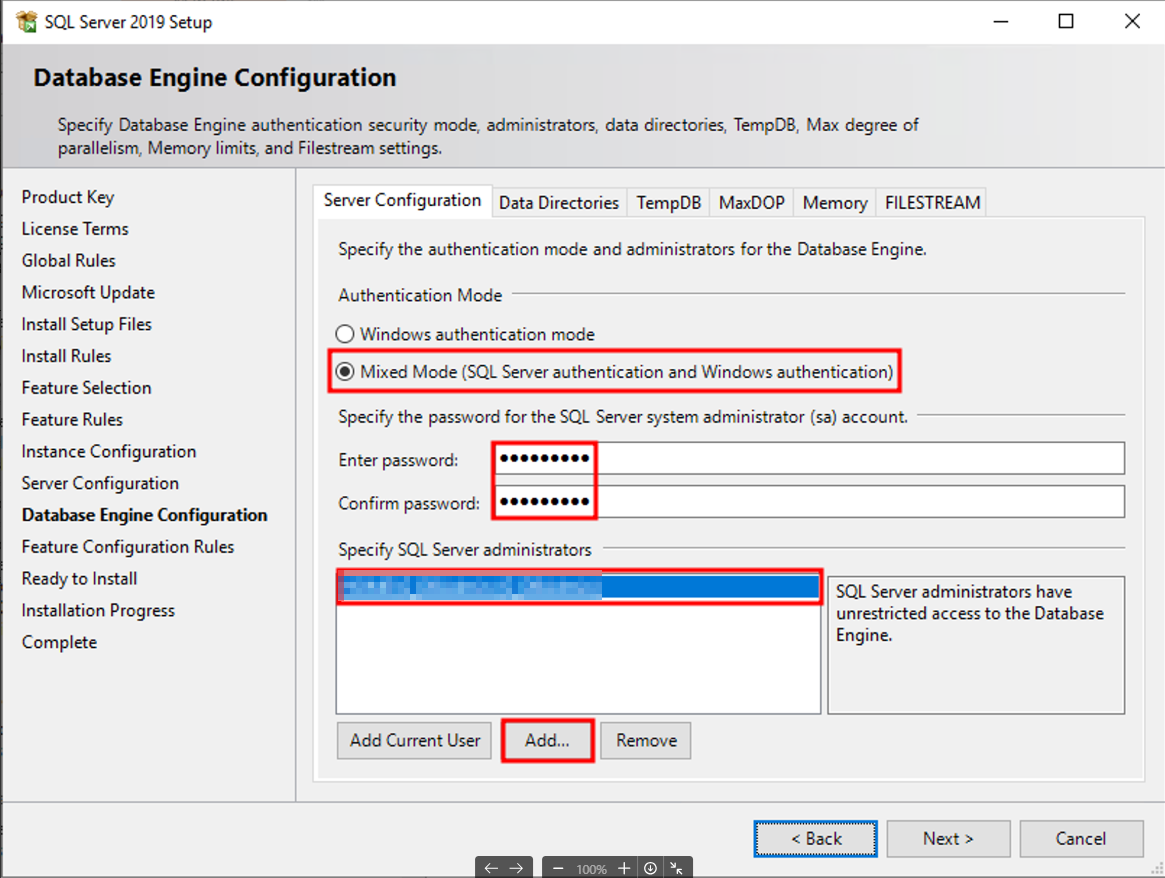 Specify SQL Server administrators : Admin 권한을 가진 계정 추가