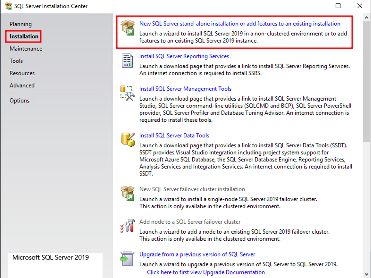 (1) New SQL Server stand-alone installation or add features to existing installation 선택