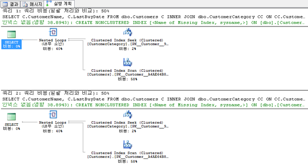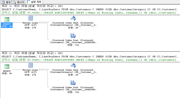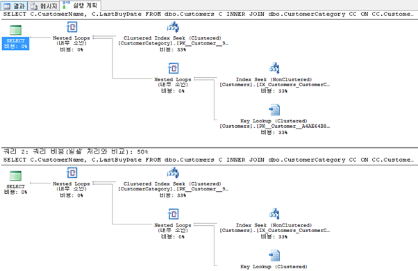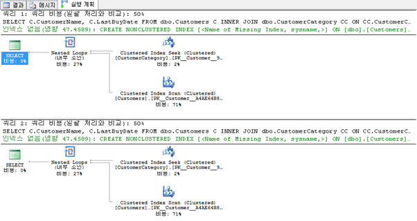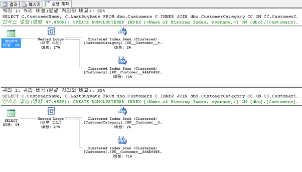 쿼리를 실행 하고 실행 계획을 살펴 보면 첫 번째 쿼리의 경우 CustomerCategory 테이블에서는 Index Seek를 사용하고 Customer 테이블에서는 Index Scan을 사용한다. 두 번째 쿼리의 경우 Customer 테이블에서 비클러스터 인덱스(IX_Customers_CustomerCategoryID)를 사용한다.