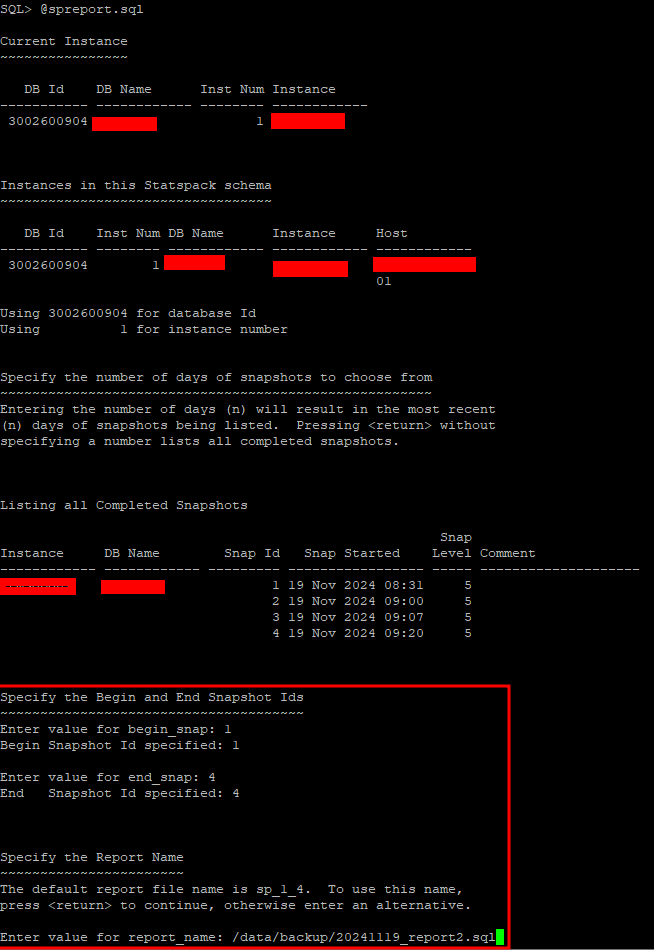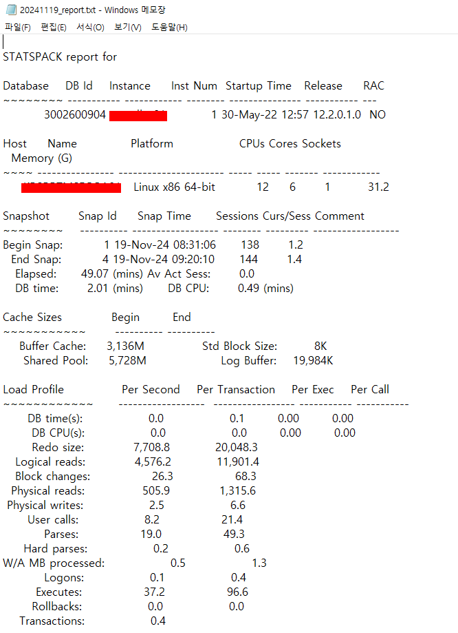 - statspack report는 2개의 snapshot을 이용하여 얻어지므로 report를 뽑으려면 최소 2개 이상의 snapshot이 존재해야 한다. 그리고 그 snapshot사이에는 shutdown 작업이 없어야한다.