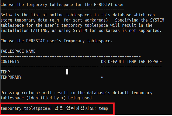 sql 파일 실행 시 나오는 temp tablespace 목록 중 dafault 값이 되는 테이블스페이스를 지정한다.