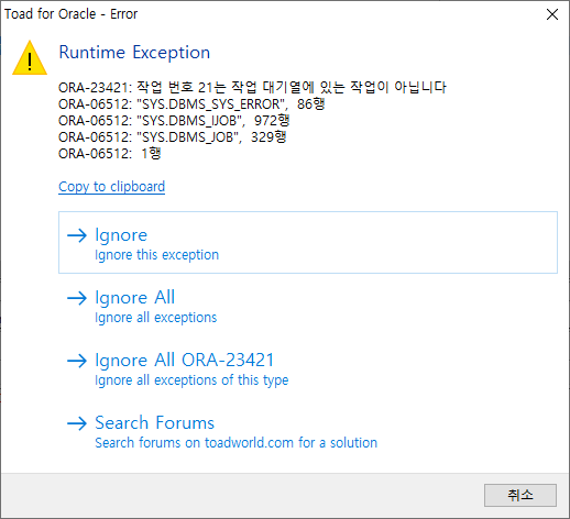 sys 계정으로 create job 권한 부여 후 재 실행.