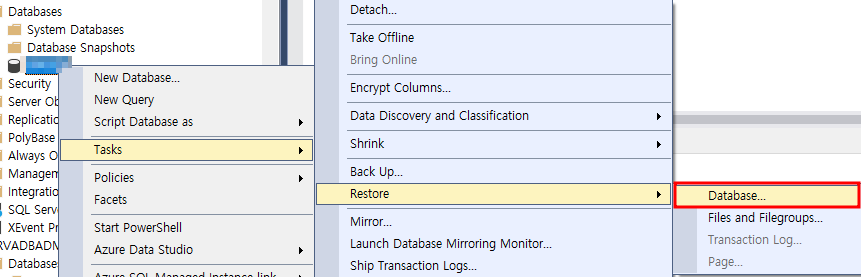 => 복원 작업을 수행하기 전, 해당 DB가 Single-User 모드로 설정되고 복원 작업이 완료될 때에 Multi-User 모드로 돌아온다.