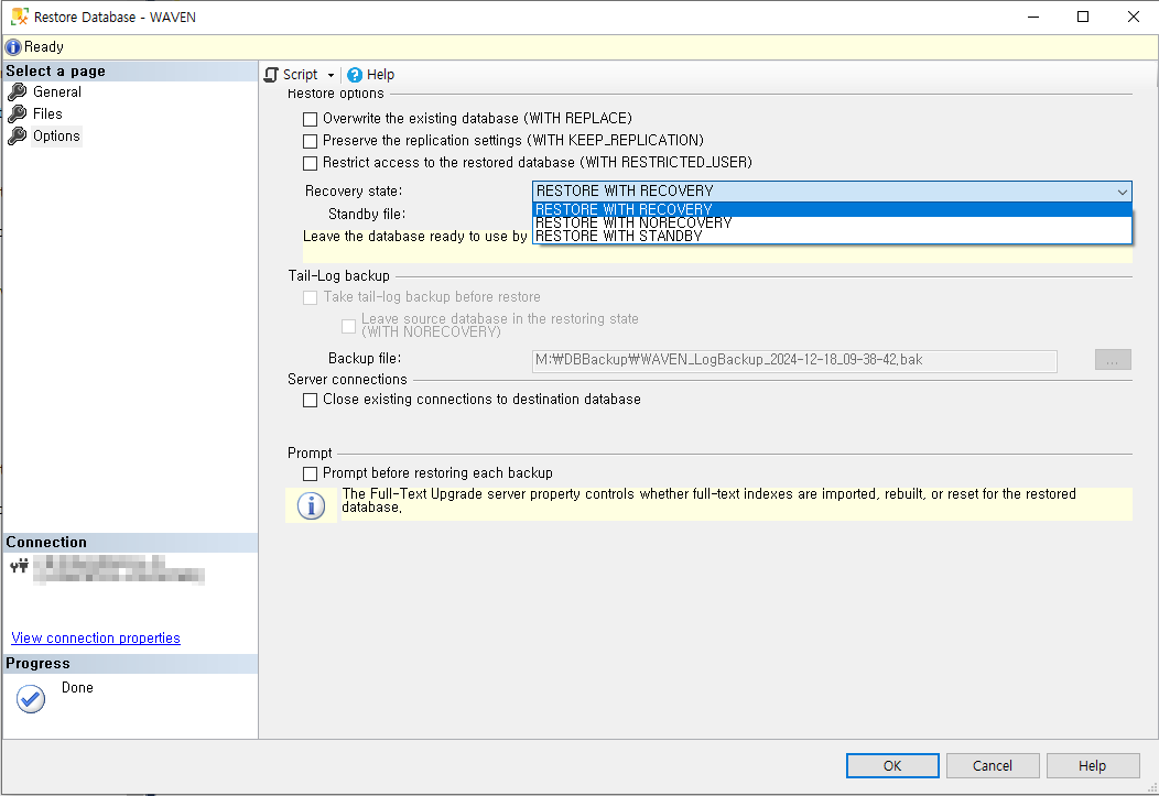 [MSSQL] SSMS Restore Database(DB 복원) - 옵션 페이지(Restore options / Tail-Log backup / Server connections 등)