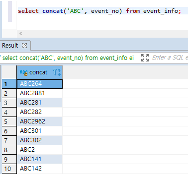 select concat('ABC', event_no) from event_info;