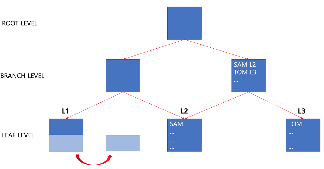 - INDEX의 특성 중 데이터가 INSERT 될 때, 테이블과 달리 새로 입력되는 데이터가 들어가는 자리가 정해져 있다. 만약 들어가야할 블럭에 이미 다른 데이터로 꽉 차 있는 경우, 데이터를 잘라 새로운 LEAF 블록에 절반을 저장한다.