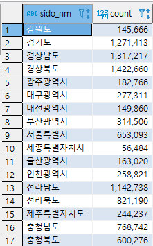 - COUNT(*)는 각 시도별로 하위 도로명 주소의 갯수를 의미함.