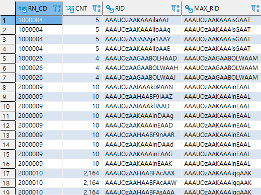 MAX(RA.ROWID) over (partition by RA.RN_CD) AS MAX_RID