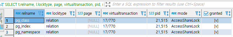 현재 테이블에 lock을 확인 할 수 있다. 기본적으로 대부분의 lock 테이블은 괜찮으나 RowExclusiveLock 이 검색된다면 해당 테이블에 접근이 지연되어 다른 쿼리에도 영향을 미칠 수 있으므로 반드시 잡고있는 트랜잭션이나 서버 상태 등을 점검하여 lock을 해제 해 주는 작업이 필요하다.