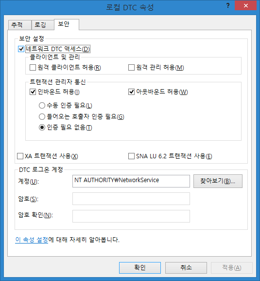 2. 보안 탭에서 [네트워크 DTC 액세스] 활성화 체크