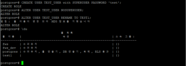 예시) postgres=# CREATE USER test_user with PASSWORD 'test' superuser;