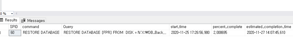 백업 또는 DBCC 관련 작업을 수행할 때 실시간 작업 진행율을 확인하는 쿼리